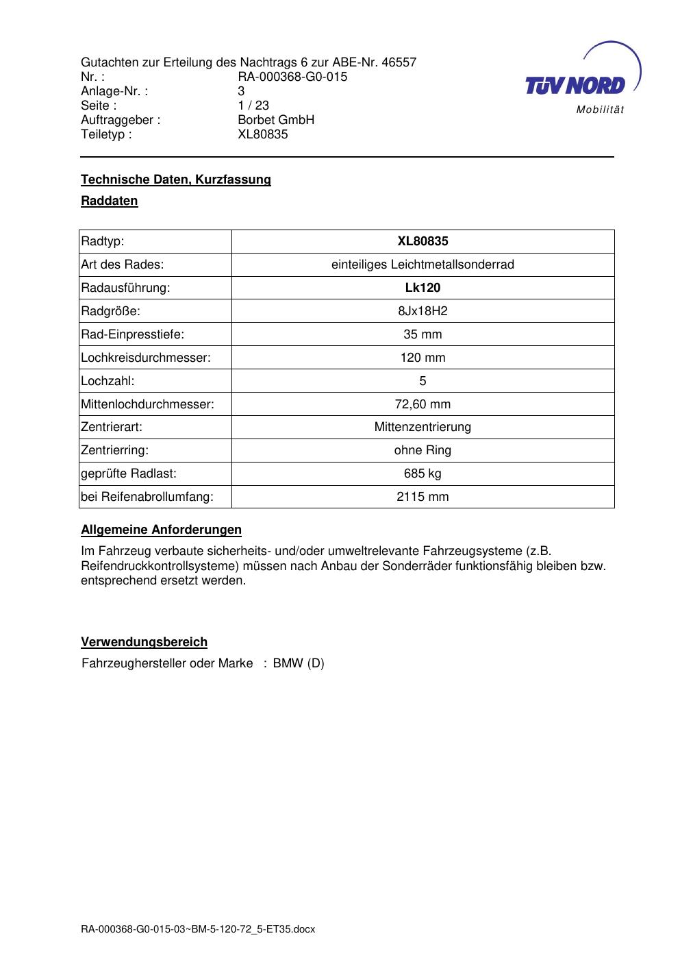Dieses Gutachten (abe) bezieht sich auf die Alufelge brand-borbet XL80835 in der Ausführung 8Jx18 ET 0, Mittenloch 0 mm (KBA 46557). Im PDF findest du typischerweise zulässige Reifengrößen, Auflagen/Anbauhinweise und – je nach Dokument – Hinweise zur Eintragung.