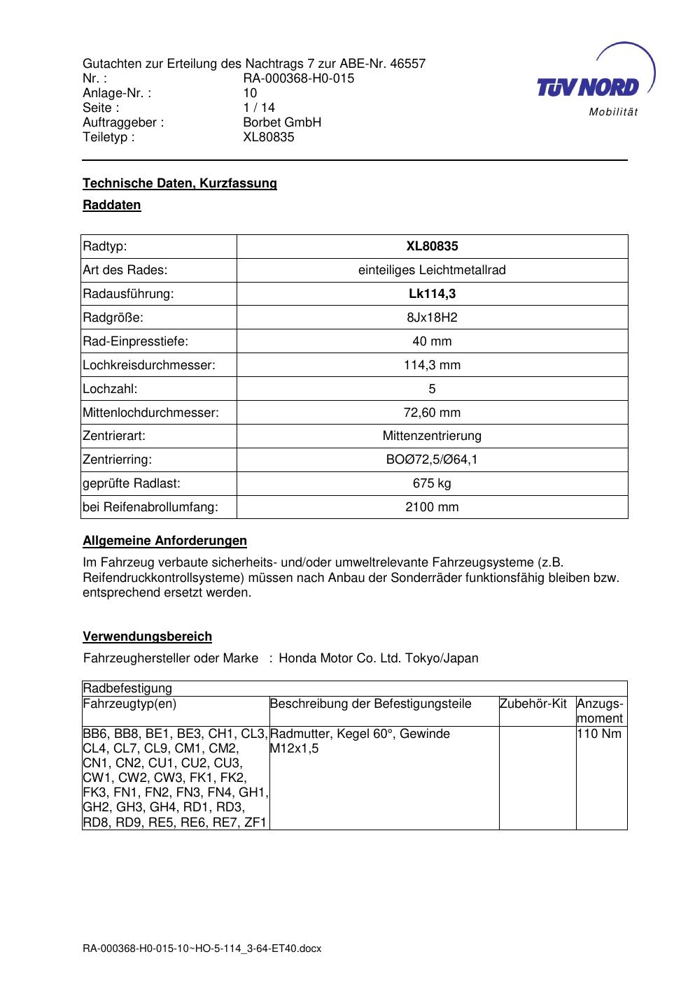 Dieses Gutachten (abe) bezieht sich auf die Alufelge brand-borbet XL80835 in der Ausführung 8Jx18 ET 0, Mittenloch 0 mm (KBA 46557). Im PDF findest du typischerweise zulässige Reifengrößen, Auflagen/Anbauhinweise und – je nach Dokument – Hinweise zur Eintragung.