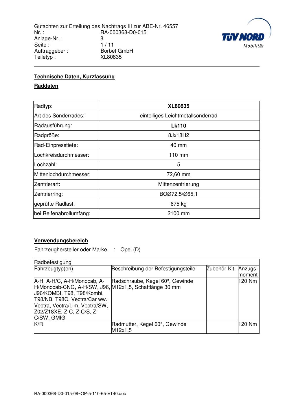 Dieses Gutachten (abe) bezieht sich auf die Alufelge brand-borbet XL80835 in der Ausführung 8Jx18 ET 0, Mittenloch 0 mm (KBA 46557). Im PDF findest du typischerweise zulässige Reifengrößen, Auflagen/Anbauhinweise und – je nach Dokument – Hinweise zur Eintragung.