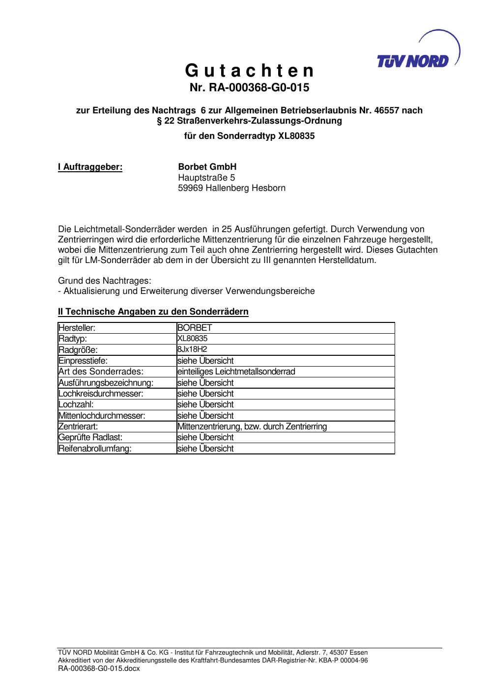 Dieses Gutachten (abe) bezieht sich auf die Alufelge brand-borbet XL80835 in der Ausführung 8Jx18 ET 0, Mittenloch 0 mm (KBA 46557). Im PDF findest du typischerweise zulässige Reifengrößen, Auflagen/Anbauhinweise und – je nach Dokument – Hinweise zur Eintragung.
