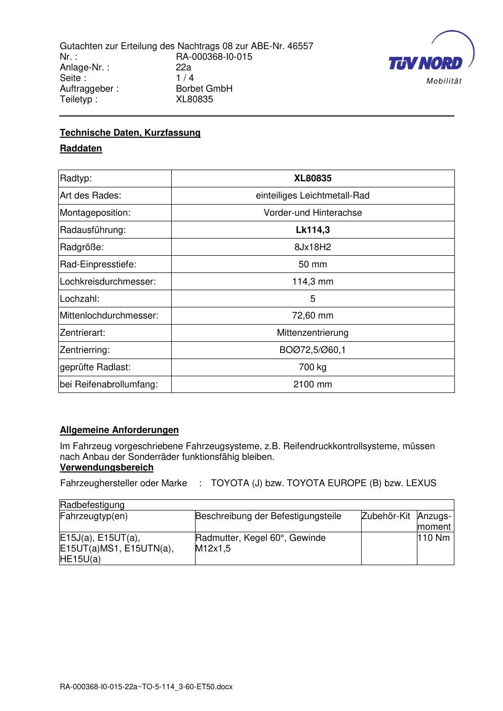 Dieses Gutachten (abe) bezieht sich auf die Alufelge brand-borbet XL80835 in der Ausführung 8Jx18 ET 0, Mittenloch 0 mm (KBA 46557). Im PDF findest du typischerweise zulässige Reifengrößen, Auflagen/Anbauhinweise und – je nach Dokument – Hinweise zur Eintragung.