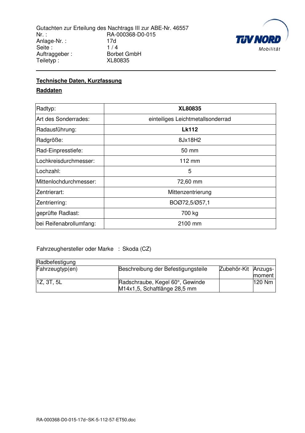 Dieses Gutachten (abe) bezieht sich auf die Alufelge brand-borbet XL80835 in der Ausführung 8Jx18 ET 0, Mittenloch 0 mm (KBA 46557). Im PDF findest du typischerweise zulässige Reifengrößen, Auflagen/Anbauhinweise und – je nach Dokument – Hinweise zur Eintragung.