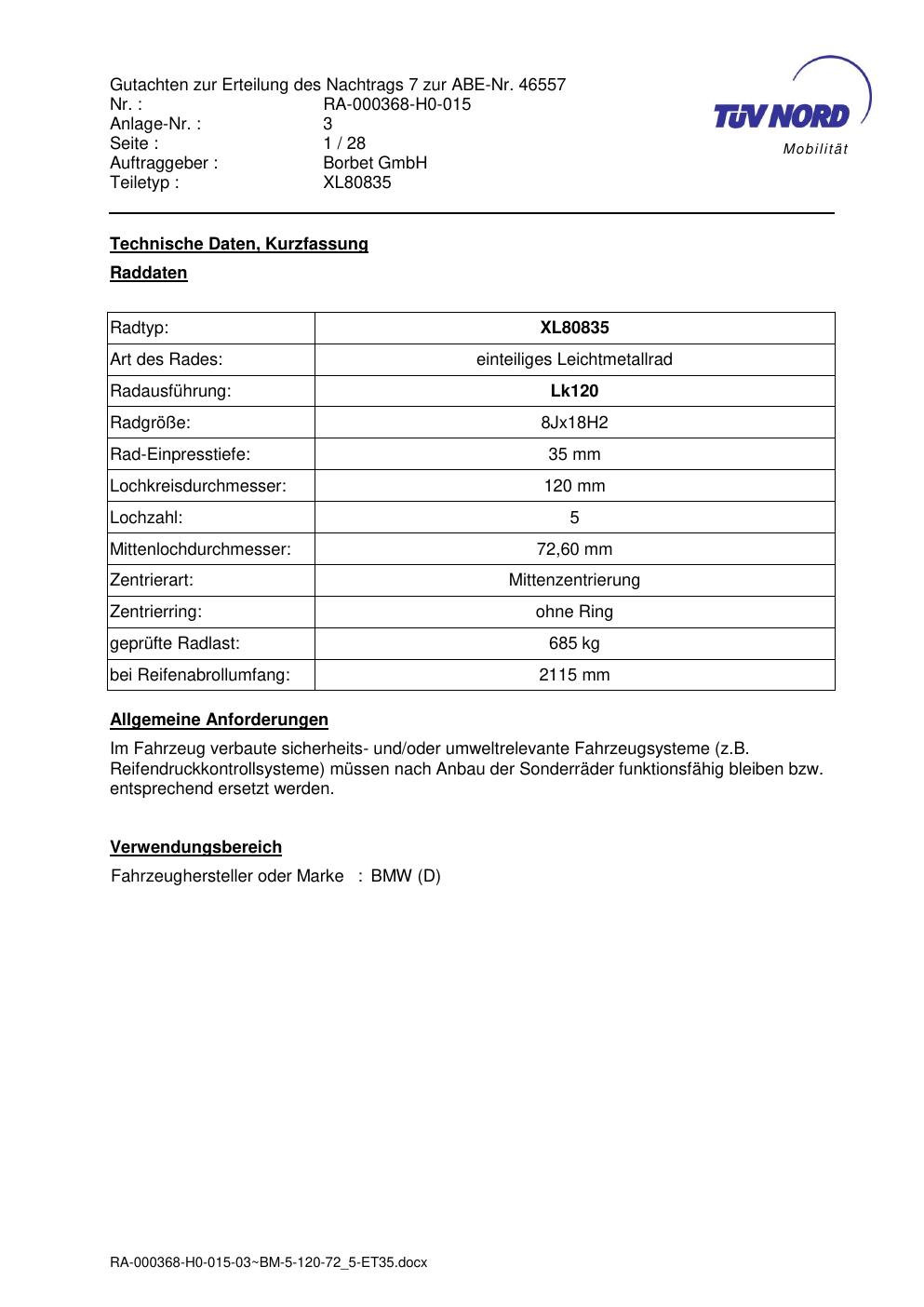 Dieses Gutachten (abe) bezieht sich auf die Alufelge brand-borbet XL80835 in der Ausführung 8Jx18 ET 0, Mittenloch 0 mm (KBA 46557). Im PDF findest du typischerweise zulässige Reifengrößen, Auflagen/Anbauhinweise und – je nach Dokument – Hinweise zur Eintragung.