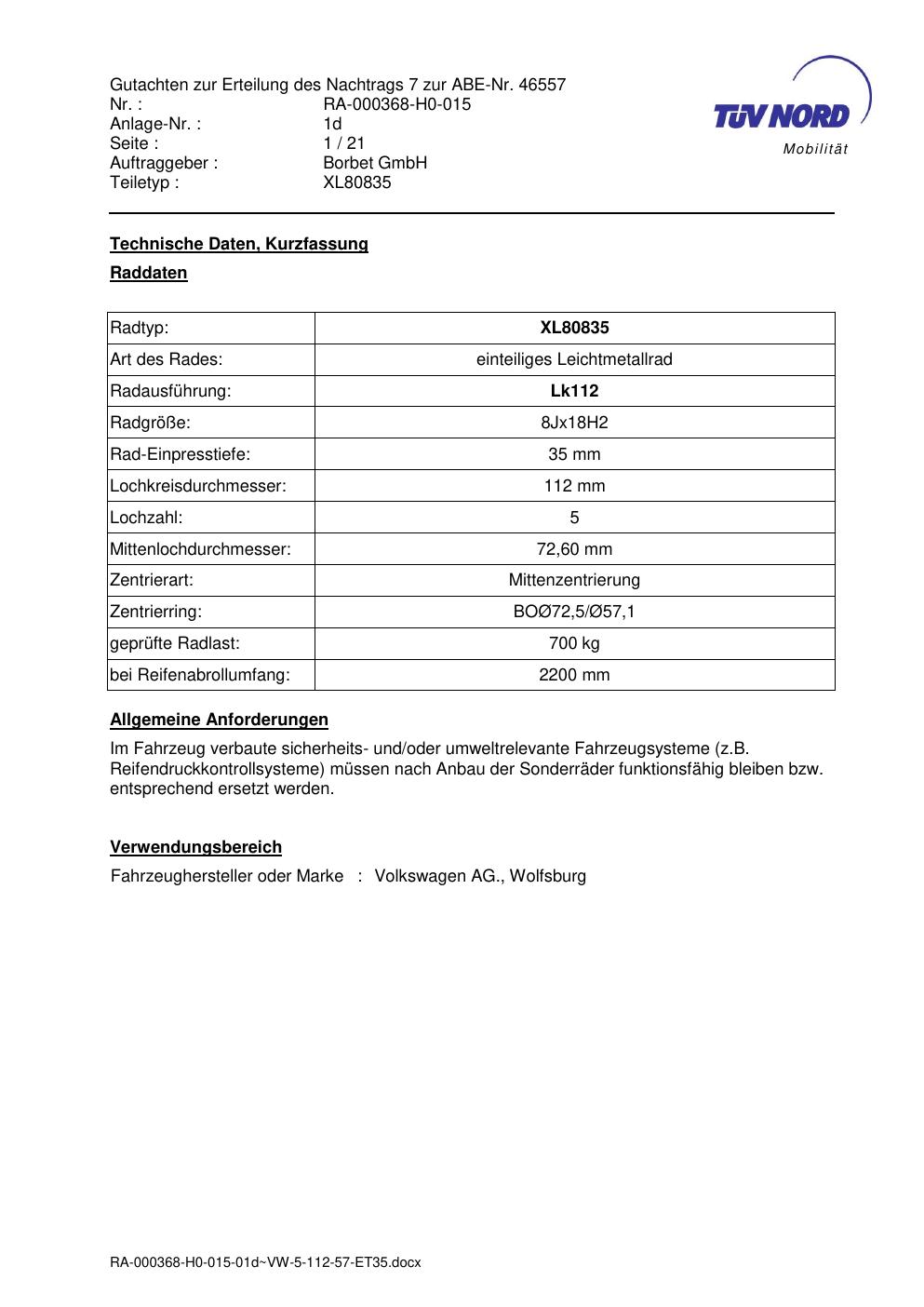 Dieses Gutachten (abe) bezieht sich auf die Alufelge brand-borbet XL80835 in der Ausführung 8Jx18 ET 0, Mittenloch 0 mm (KBA 46557). Im PDF findest du typischerweise zulässige Reifengrößen, Auflagen/Anbauhinweise und – je nach Dokument – Hinweise zur Eintragung.