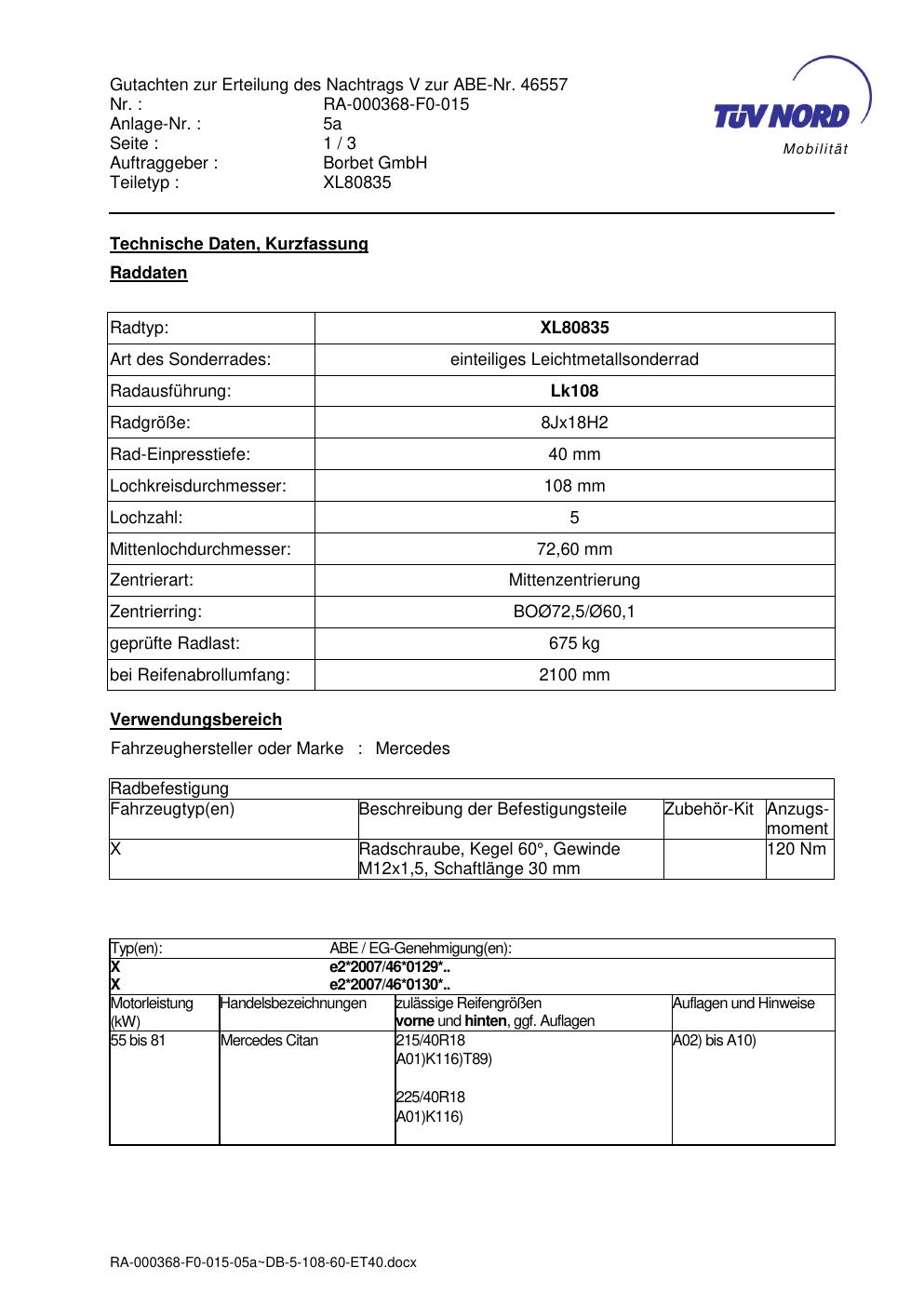 Dieses Gutachten (abe) bezieht sich auf die Alufelge brand-borbet XL80835 in der Ausführung 8Jx18 ET 0, Mittenloch 0 mm (KBA 46557). Im PDF findest du typischerweise zulässige Reifengrößen, Auflagen/Anbauhinweise und – je nach Dokument – Hinweise zur Eintragung.