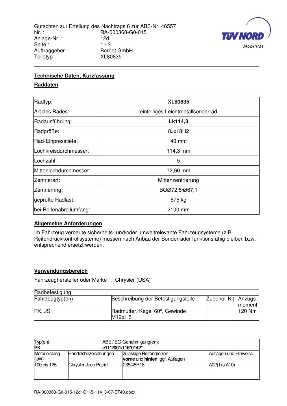 Dieses Gutachten (abe) bezieht sich auf die Alufelge brand-borbet XL80835 in der Ausführung 8Jx18 ET 0, Mittenloch 0 mm (KBA 46557). Im PDF findest du typischerweise zulässige Reifengrößen, Auflagen/Anbauhinweise und – je nach Dokument – Hinweise zur Eintragung.