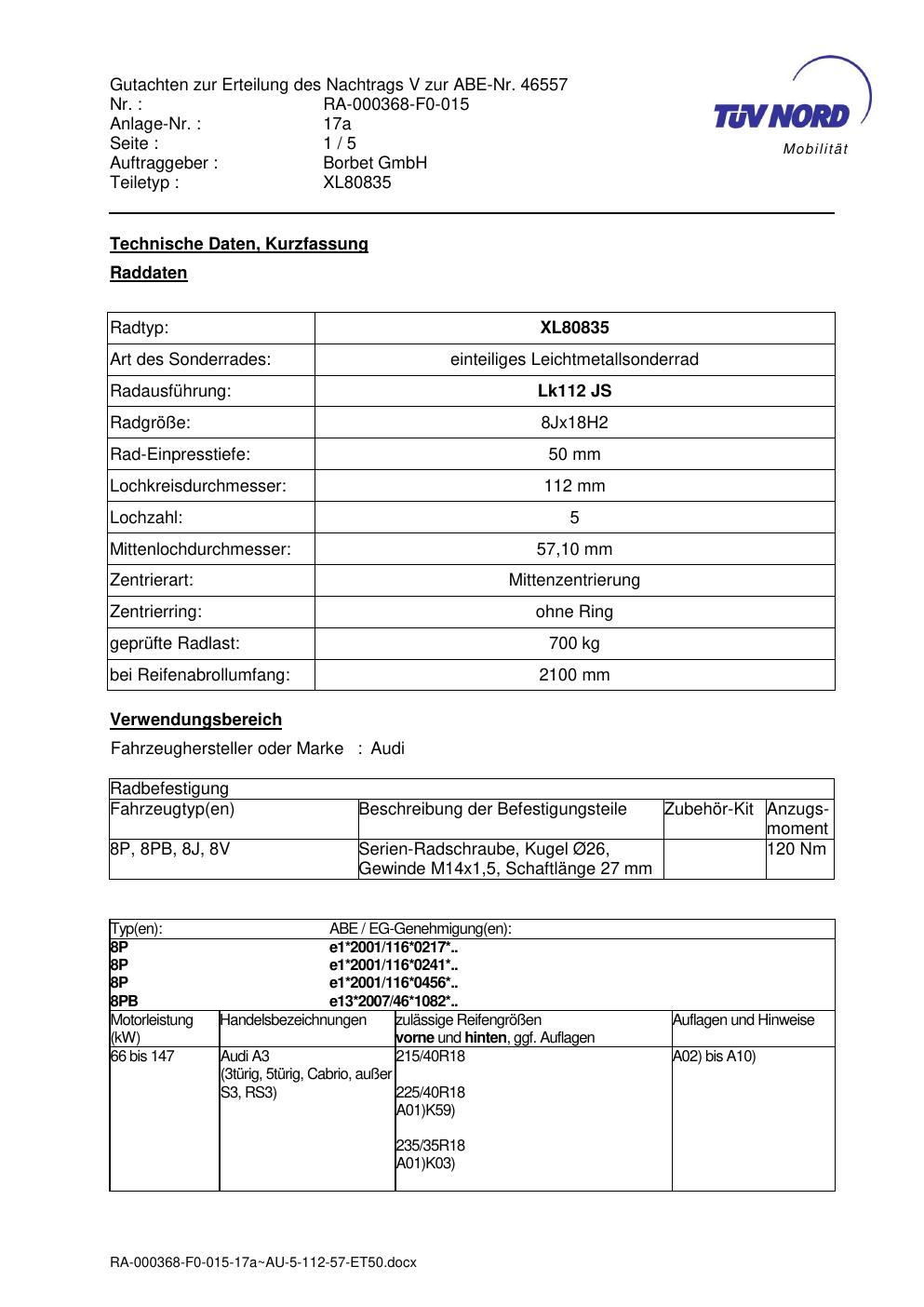 Dieses Gutachten (abe) bezieht sich auf die Alufelge brand-borbet XL80835 in der Ausführung 8Jx18 ET 0, Mittenloch 0 mm (KBA 46557). Im PDF findest du typischerweise zulässige Reifengrößen, Auflagen/Anbauhinweise und – je nach Dokument – Hinweise zur Eintragung.