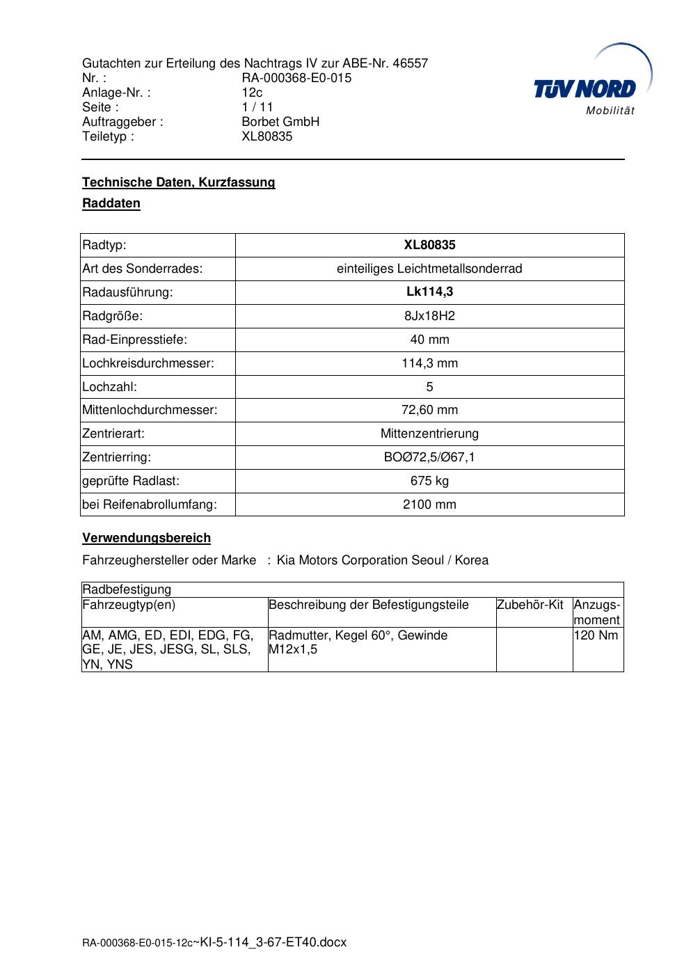 Dieses Gutachten (abe) bezieht sich auf die Alufelge brand-borbet XL80835 in der Ausführung 8Jx18 ET 0, Mittenloch 0 mm (KBA 46557). Im PDF findest du typischerweise zulässige Reifengrößen, Auflagen/Anbauhinweise und – je nach Dokument – Hinweise zur Eintragung.