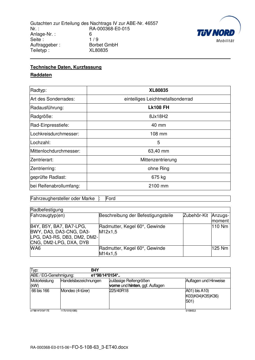 Dieses Gutachten (abe) bezieht sich auf die Alufelge brand-borbet XL80835 in der Ausführung 8Jx18 ET 0, Mittenloch 0 mm (KBA 46557). Im PDF findest du typischerweise zulässige Reifengrößen, Auflagen/Anbauhinweise und – je nach Dokument – Hinweise zur Eintragung.