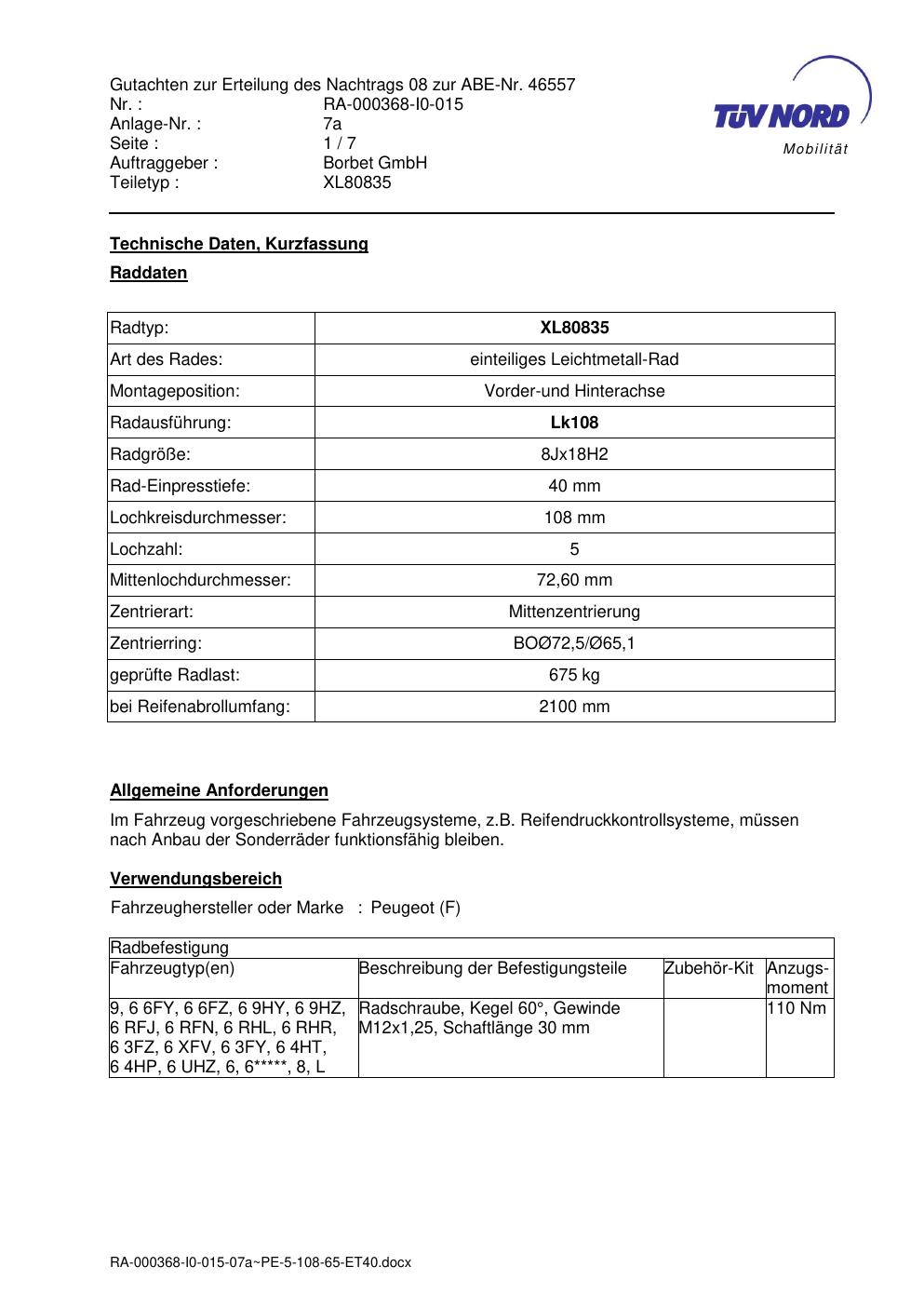 Dieses Gutachten (abe) bezieht sich auf die Alufelge brand-borbet XL80835 in der Ausführung 8Jx18 ET 0, Mittenloch 0 mm (KBA 46557). Im PDF findest du typischerweise zulässige Reifengrößen, Auflagen/Anbauhinweise und – je nach Dokument – Hinweise zur Eintragung.