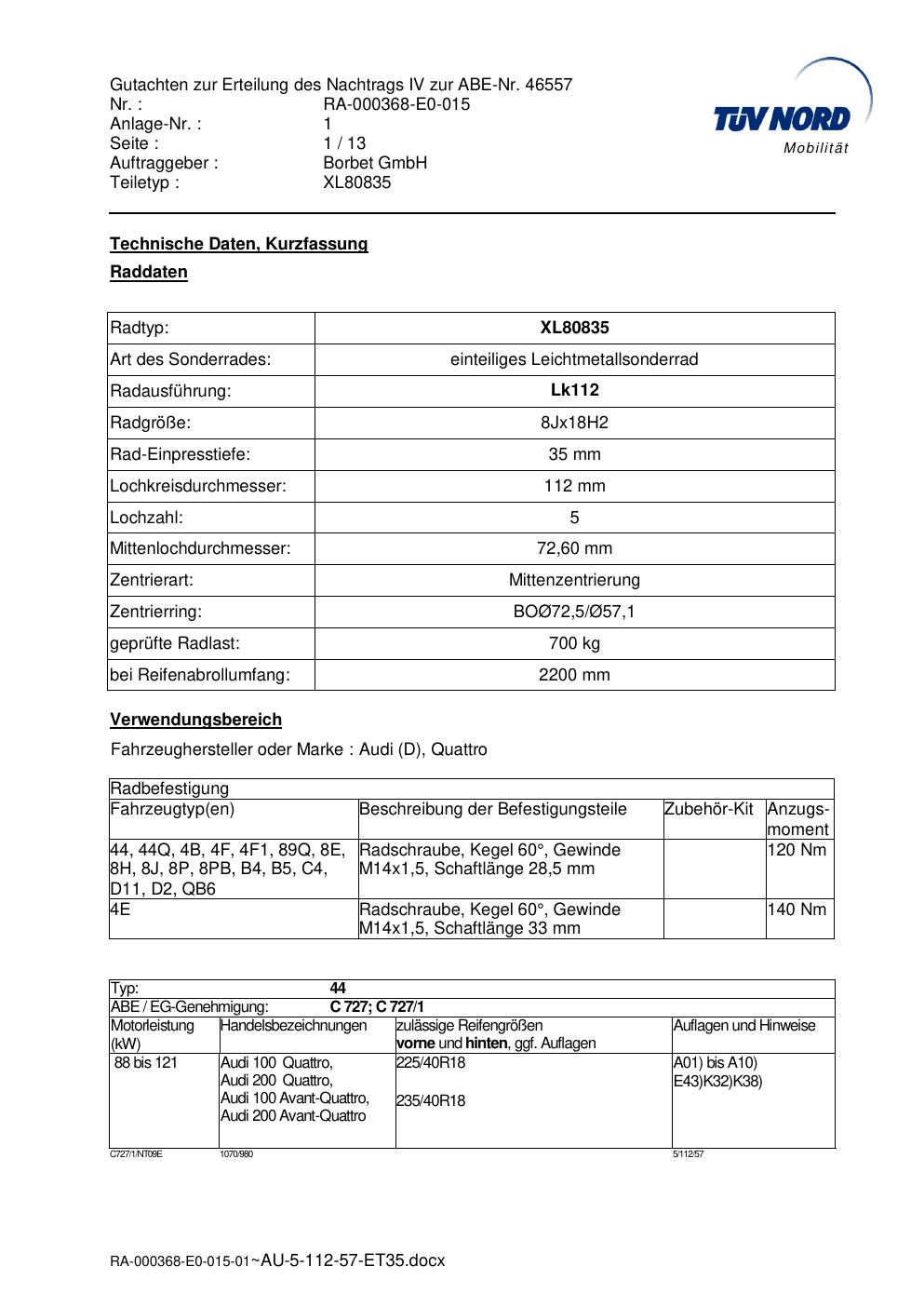Dieses Gutachten (abe) bezieht sich auf die Alufelge brand-borbet XL80835 in der Ausführung 8Jx18 ET 0, Mittenloch 0 mm (KBA 46557). Im PDF findest du typischerweise zulässige Reifengrößen, Auflagen/Anbauhinweise und – je nach Dokument – Hinweise zur Eintragung.