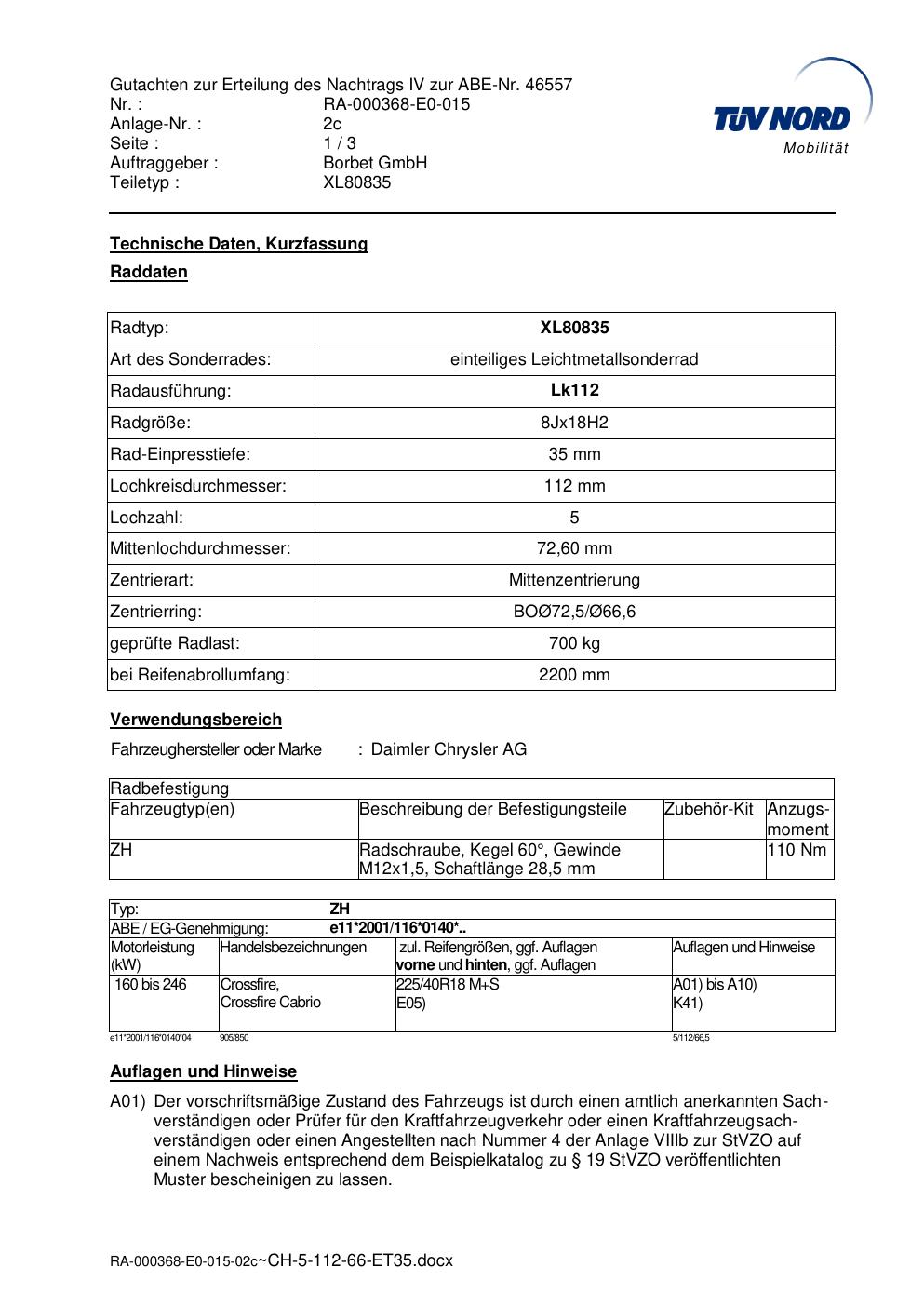 Dieses Gutachten (abe) bezieht sich auf die Alufelge brand-borbet XL80835 in der Ausführung 8Jx18 ET 0, Mittenloch 0 mm (KBA 46557). Im PDF findest du typischerweise zulässige Reifengrößen, Auflagen/Anbauhinweise und – je nach Dokument – Hinweise zur Eintragung.