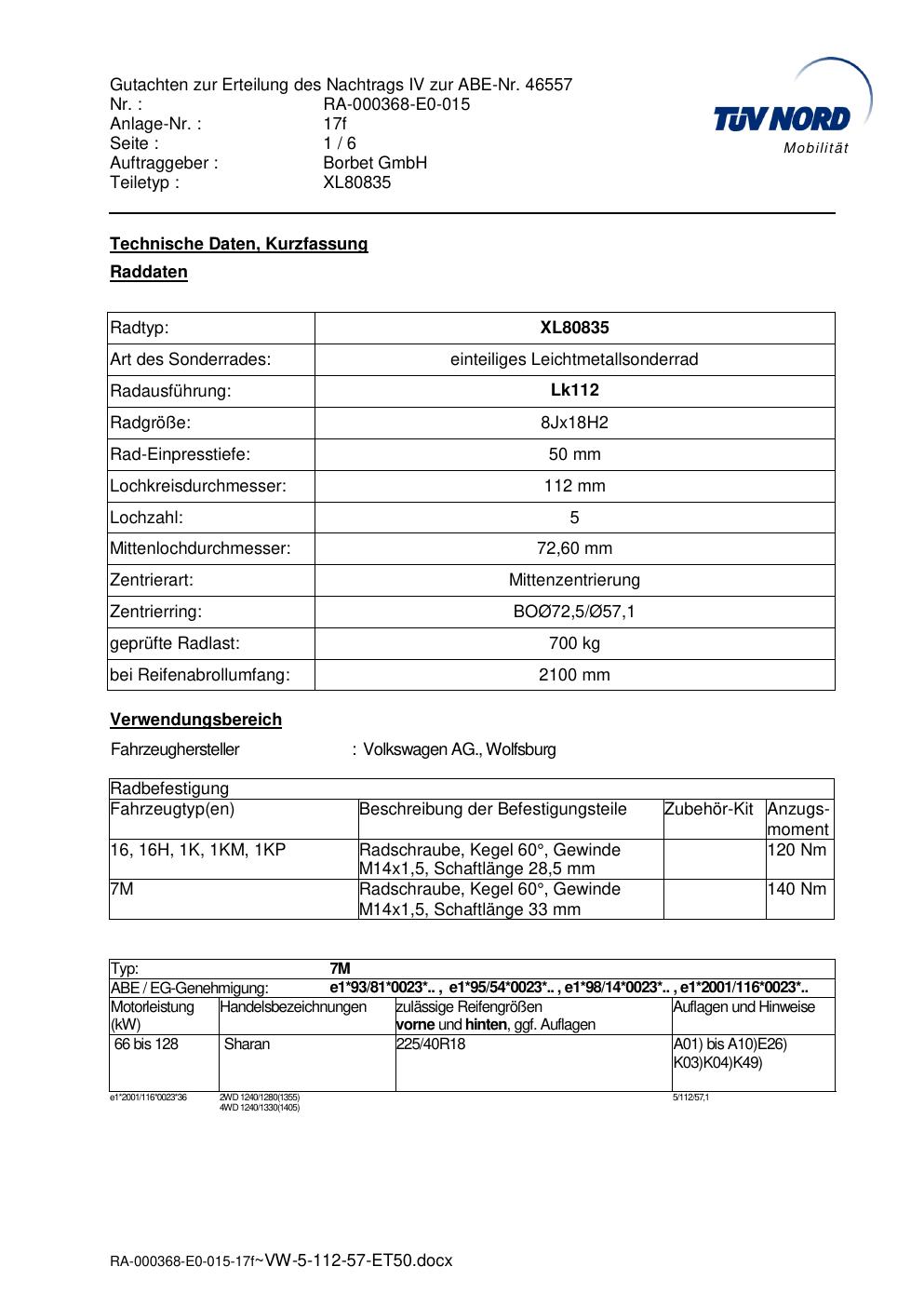 Dieses Gutachten (abe) bezieht sich auf die Alufelge brand-borbet XL80835 in der Ausführung 8Jx18 ET 0, Mittenloch 0 mm (KBA 46557). Im PDF findest du typischerweise zulässige Reifengrößen, Auflagen/Anbauhinweise und – je nach Dokument – Hinweise zur Eintragung.