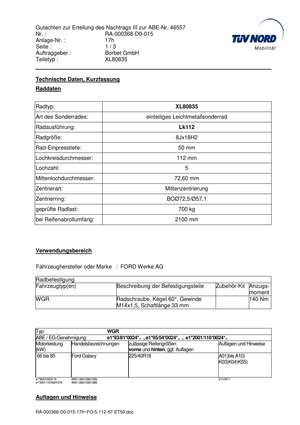Dieses Gutachten (abe) bezieht sich auf die Alufelge brand-borbet XL80835 in der Ausführung 8Jx18 ET 0, Mittenloch 0 mm (KBA 46557). Im PDF findest du typischerweise zulässige Reifengrößen, Auflagen/Anbauhinweise und – je nach Dokument – Hinweise zur Eintragung.