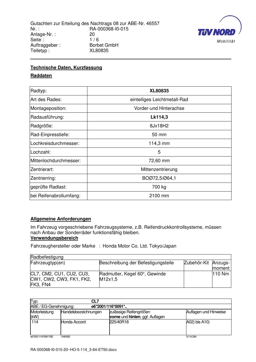 Dieses Gutachten (abe) bezieht sich auf die Alufelge brand-borbet XL80835 in der Ausführung 8Jx18 ET 0, Mittenloch 0 mm (KBA 46557). Im PDF findest du typischerweise zulässige Reifengrößen, Auflagen/Anbauhinweise und – je nach Dokument – Hinweise zur Eintragung.