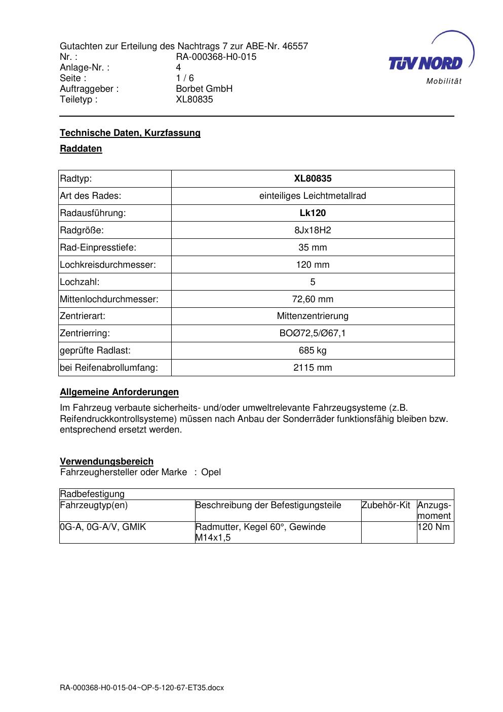 Dieses Gutachten (abe) bezieht sich auf die Alufelge brand-borbet XL80835 in der Ausführung 8Jx18 ET 0, Mittenloch 0 mm (KBA 46557). Im PDF findest du typischerweise zulässige Reifengrößen, Auflagen/Anbauhinweise und – je nach Dokument – Hinweise zur Eintragung.