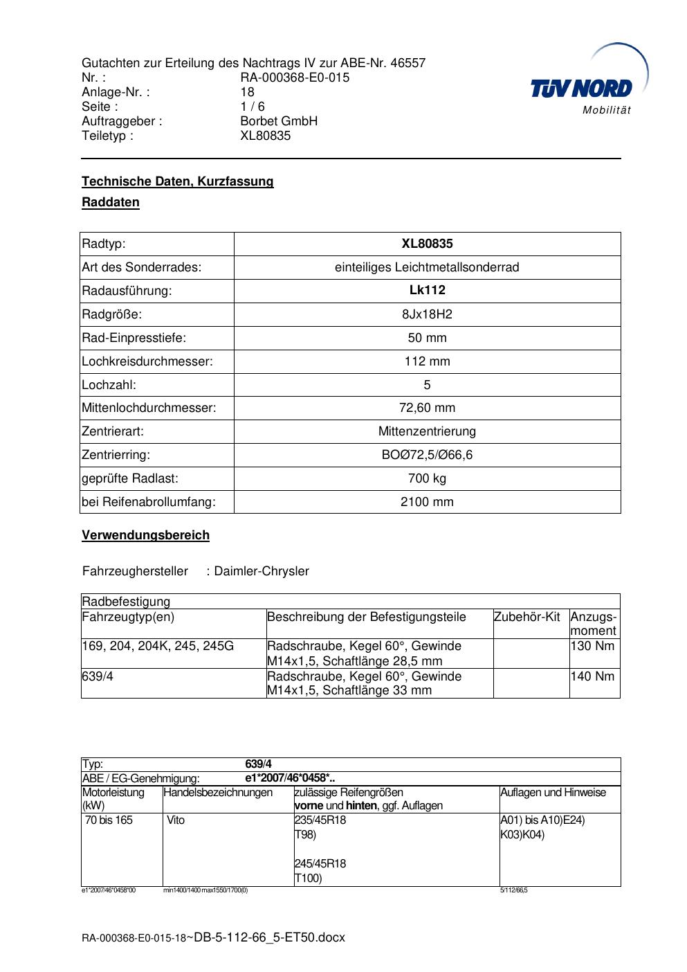 Dieses Gutachten (abe) bezieht sich auf die Alufelge brand-borbet XL80835 in der Ausführung 8Jx18 ET 0, Mittenloch 0 mm (KBA 46557). Im PDF findest du typischerweise zulässige Reifengrößen, Auflagen/Anbauhinweise und – je nach Dokument – Hinweise zur Eintragung.