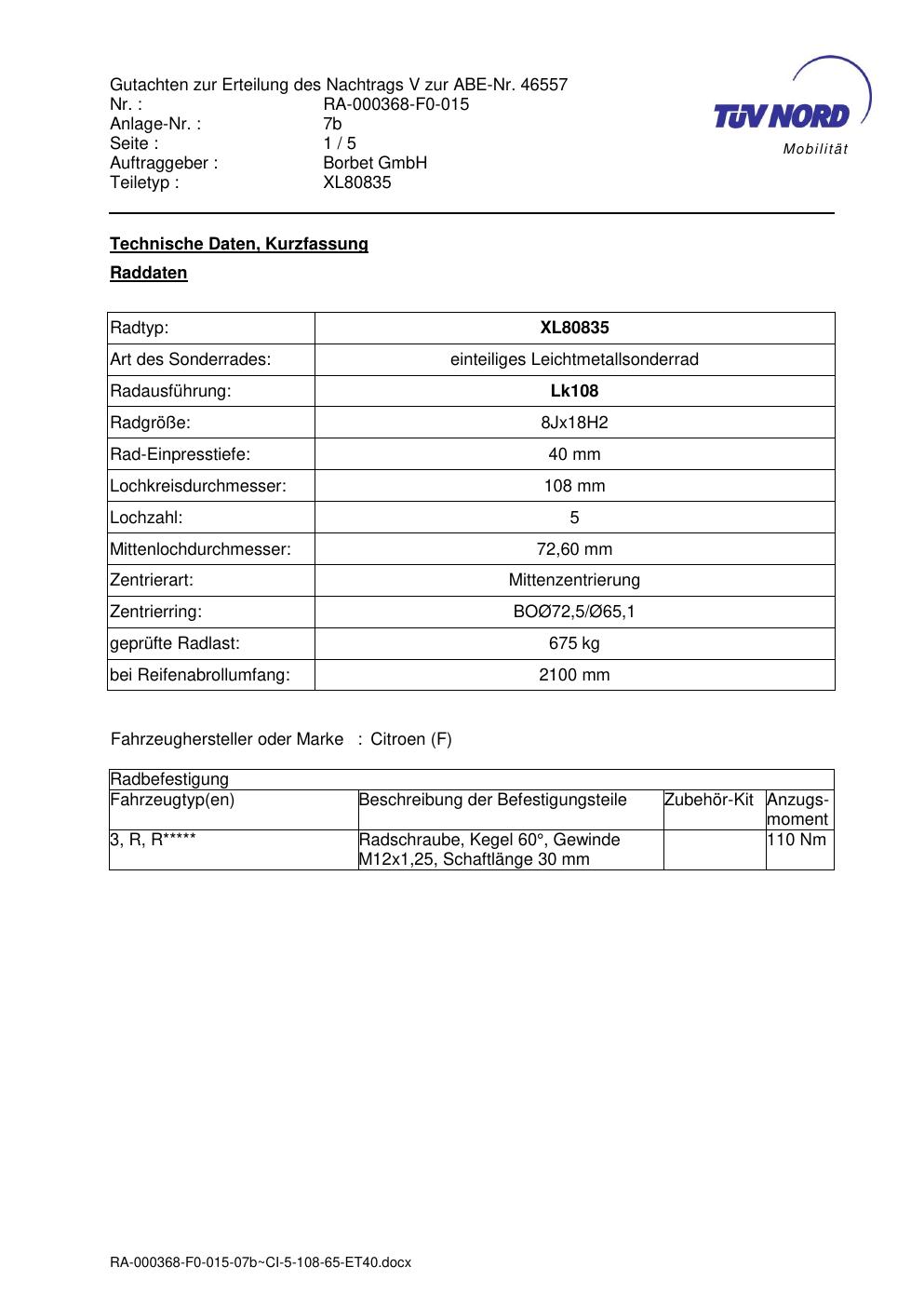 Dieses Gutachten (abe) bezieht sich auf die Alufelge brand-borbet XL80835 in der Ausführung 8Jx18 ET 0, Mittenloch 0 mm (KBA 46557). Im PDF findest du typischerweise zulässige Reifengrößen, Auflagen/Anbauhinweise und – je nach Dokument – Hinweise zur Eintragung.