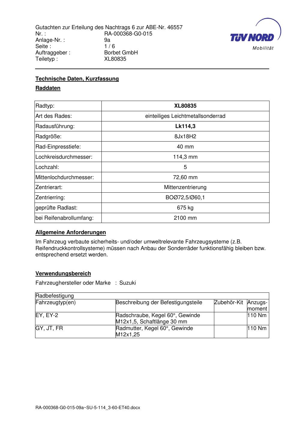 Dieses Gutachten (abe) bezieht sich auf die Alufelge brand-borbet XL80835 in der Ausführung 8Jx18 ET 0, Mittenloch 0 mm (KBA 46557). Im PDF findest du typischerweise zulässige Reifengrößen, Auflagen/Anbauhinweise und – je nach Dokument – Hinweise zur Eintragung.