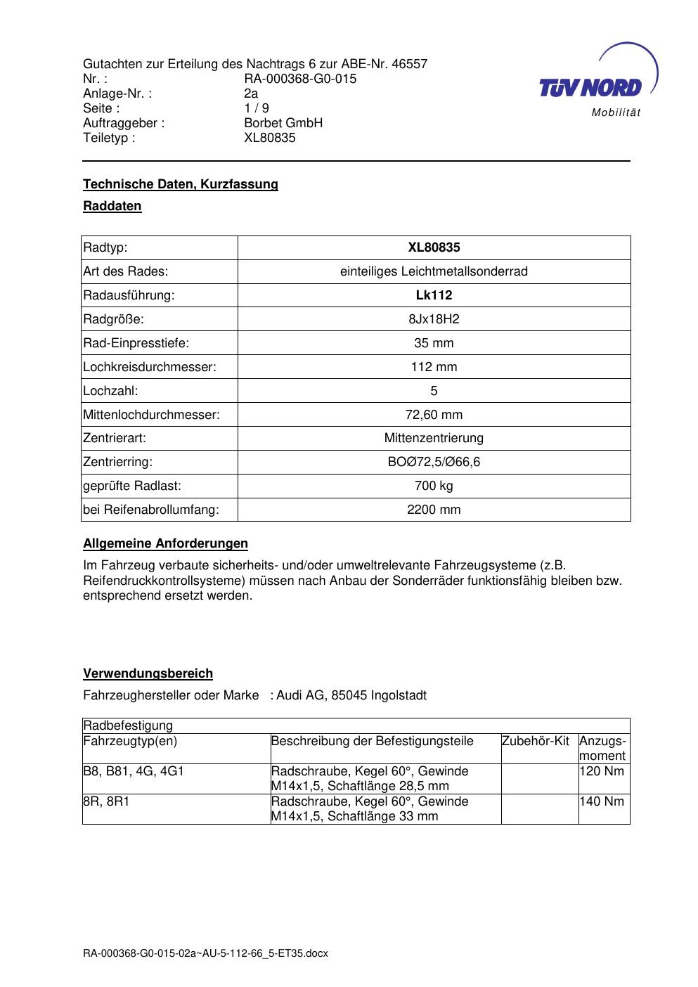 Dieses Gutachten (abe) bezieht sich auf die Alufelge brand-borbet XL80835 in der Ausführung 8Jx18 ET 0, Mittenloch 0 mm (KBA 46557). Im PDF findest du typischerweise zulässige Reifengrößen, Auflagen/Anbauhinweise und – je nach Dokument – Hinweise zur Eintragung.