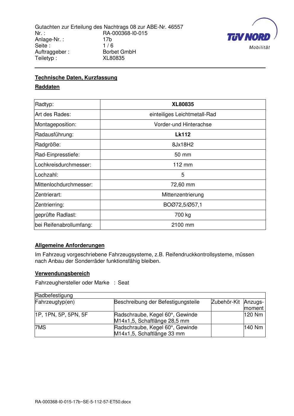 Dieses Gutachten (abe) bezieht sich auf die Alufelge brand-borbet XL80835 in der Ausführung 8Jx18 ET 0, Mittenloch 0 mm (KBA 46557). Im PDF findest du typischerweise zulässige Reifengrößen, Auflagen/Anbauhinweise und – je nach Dokument – Hinweise zur Eintragung.