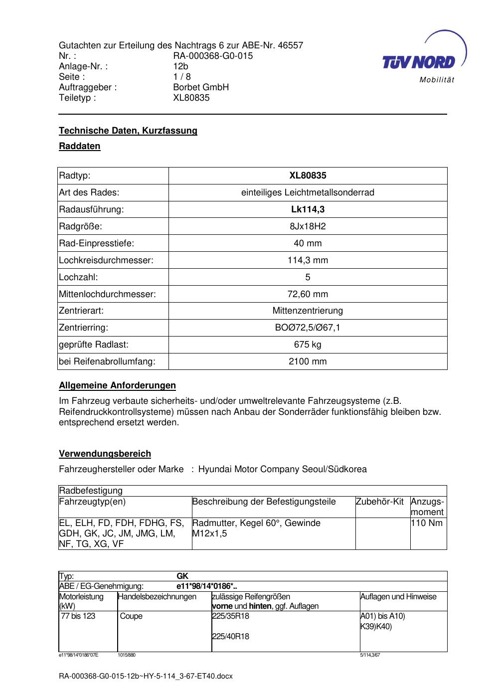 Dieses Gutachten (abe) bezieht sich auf die Alufelge brand-borbet XL80835 in der Ausführung 8Jx18 ET 0, Mittenloch 0 mm (KBA 46557). Im PDF findest du typischerweise zulässige Reifengrößen, Auflagen/Anbauhinweise und – je nach Dokument – Hinweise zur Eintragung.