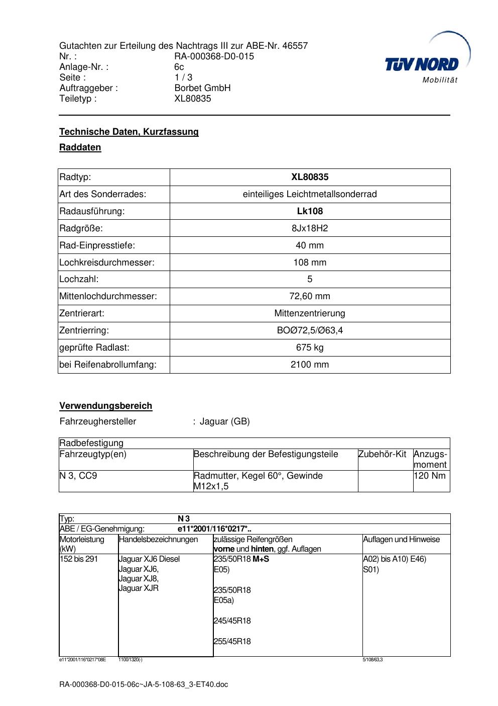Dieses Gutachten (abe) bezieht sich auf die Alufelge brand-borbet XL80835 in der Ausführung 8Jx18 ET 0, Mittenloch 0 mm (KBA 46557). Im PDF findest du typischerweise zulässige Reifengrößen, Auflagen/Anbauhinweise und – je nach Dokument – Hinweise zur Eintragung.