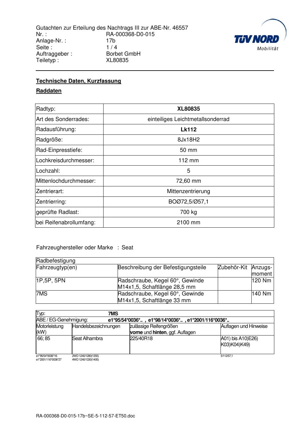 Dieses Gutachten (abe) bezieht sich auf die Alufelge brand-borbet XL80835 in der Ausführung 8Jx18 ET 0, Mittenloch 0 mm (KBA 46557). Im PDF findest du typischerweise zulässige Reifengrößen, Auflagen/Anbauhinweise und – je nach Dokument – Hinweise zur Eintragung.