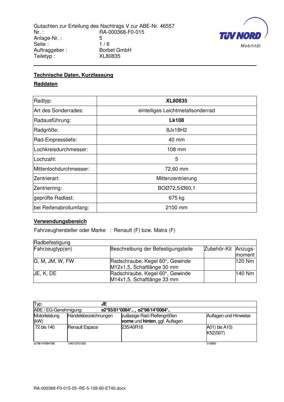 Dieses Gutachten (abe) bezieht sich auf die Alufelge brand-borbet XL80835 in der Ausführung 8Jx18 ET 0, Mittenloch 0 mm (KBA 46557). Im PDF findest du typischerweise zulässige Reifengrößen, Auflagen/Anbauhinweise und – je nach Dokument – Hinweise zur Eintragung.