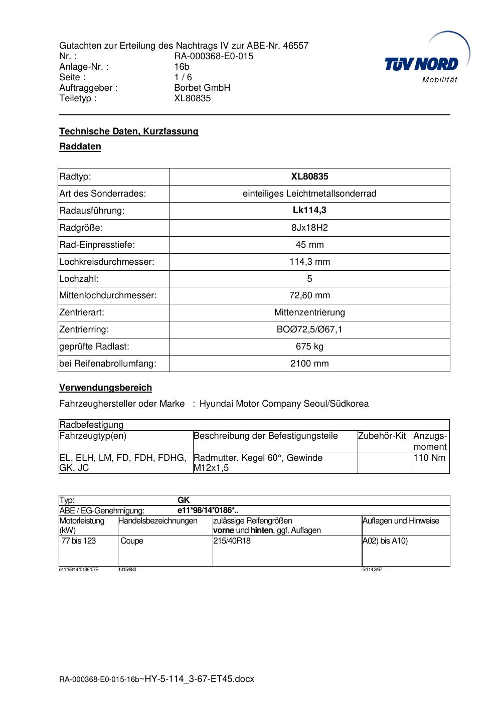 Dieses Gutachten (abe) bezieht sich auf die Alufelge brand-borbet XL80835 in der Ausführung 8Jx18 ET 0, Mittenloch 0 mm (KBA 46557). Im PDF findest du typischerweise zulässige Reifengrößen, Auflagen/Anbauhinweise und – je nach Dokument – Hinweise zur Eintragung.