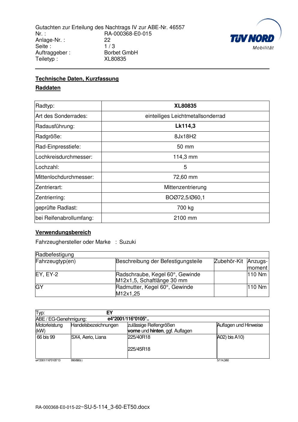 Dieses Gutachten (abe) bezieht sich auf die Alufelge brand-borbet XL80835 in der Ausführung 8Jx18 ET 0, Mittenloch 0 mm (KBA 46557). Im PDF findest du typischerweise zulässige Reifengrößen, Auflagen/Anbauhinweise und – je nach Dokument – Hinweise zur Eintragung.