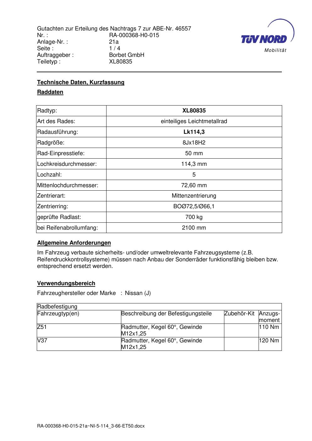 Dieses Gutachten (abe) bezieht sich auf die Alufelge brand-borbet XL80835 in der Ausführung 8Jx18 ET 0, Mittenloch 0 mm (KBA 46557). Im PDF findest du typischerweise zulässige Reifengrößen, Auflagen/Anbauhinweise und – je nach Dokument – Hinweise zur Eintragung.