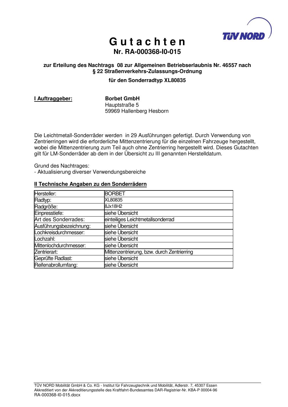 Dieses Gutachten (abe) bezieht sich auf die Alufelge brand-borbet XL80835 in der Ausführung 8Jx18 ET 0, Mittenloch 0 mm (KBA 46557). Im PDF findest du typischerweise zulässige Reifengrößen, Auflagen/Anbauhinweise und – je nach Dokument – Hinweise zur Eintragung.