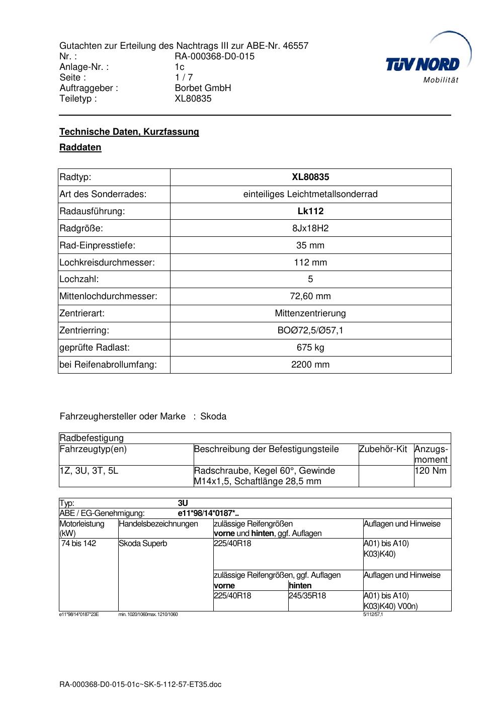 Dieses Gutachten (abe) bezieht sich auf die Alufelge brand-borbet XL80835 in der Ausführung 8Jx18 ET 0, Mittenloch 0 mm (KBA 46557). Im PDF findest du typischerweise zulässige Reifengrößen, Auflagen/Anbauhinweise und – je nach Dokument – Hinweise zur Eintragung.