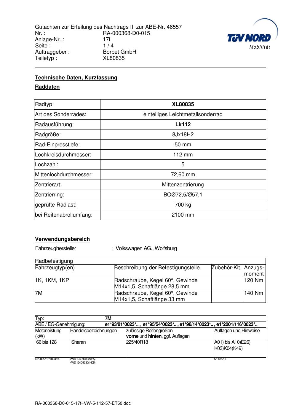Dieses Gutachten (abe) bezieht sich auf die Alufelge brand-borbet XL80835 in der Ausführung 8Jx18 ET 0, Mittenloch 0 mm (KBA 46557). Im PDF findest du typischerweise zulässige Reifengrößen, Auflagen/Anbauhinweise und – je nach Dokument – Hinweise zur Eintragung.