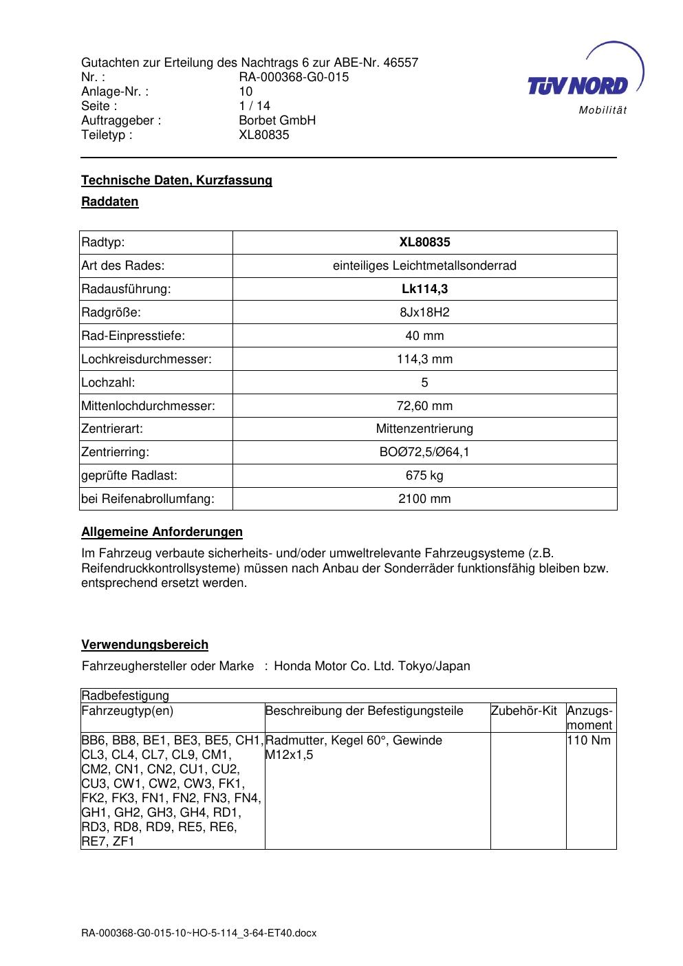 Dieses Gutachten (abe) bezieht sich auf die Alufelge brand-borbet XL80835 in der Ausführung 8Jx18 ET 0, Mittenloch 0 mm (KBA 46557). Im PDF findest du typischerweise zulässige Reifengrößen, Auflagen/Anbauhinweise und – je nach Dokument – Hinweise zur Eintragung.