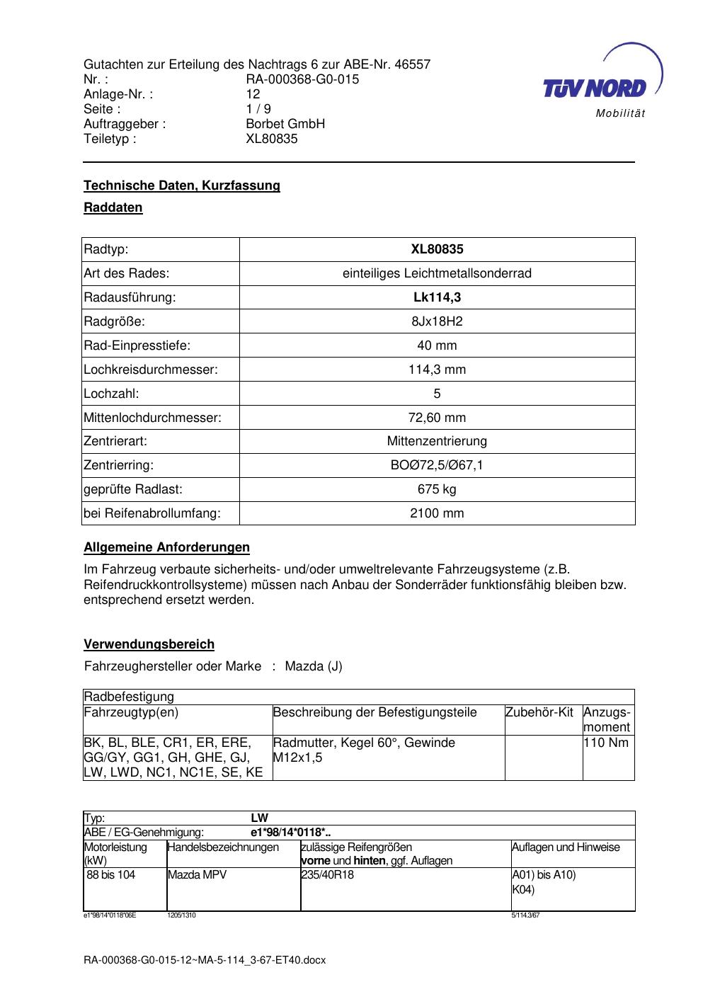 Dieses Gutachten (abe) bezieht sich auf die Alufelge brand-borbet XL80835 in der Ausführung 8Jx18 ET 0, Mittenloch 0 mm (KBA 46557). Im PDF findest du typischerweise zulässige Reifengrößen, Auflagen/Anbauhinweise und – je nach Dokument – Hinweise zur Eintragung.