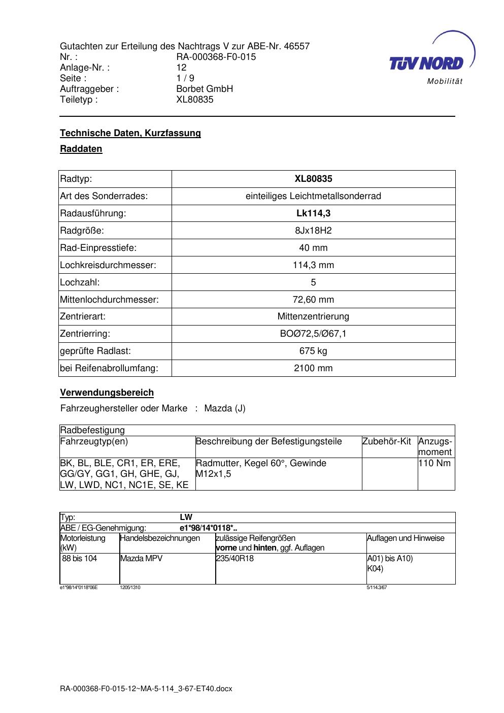 Dieses Gutachten (abe) bezieht sich auf die Alufelge brand-borbet XL80835 in der Ausführung 8Jx18 ET 0, Mittenloch 0 mm (KBA 46557). Im PDF findest du typischerweise zulässige Reifengrößen, Auflagen/Anbauhinweise und – je nach Dokument – Hinweise zur Eintragung.
