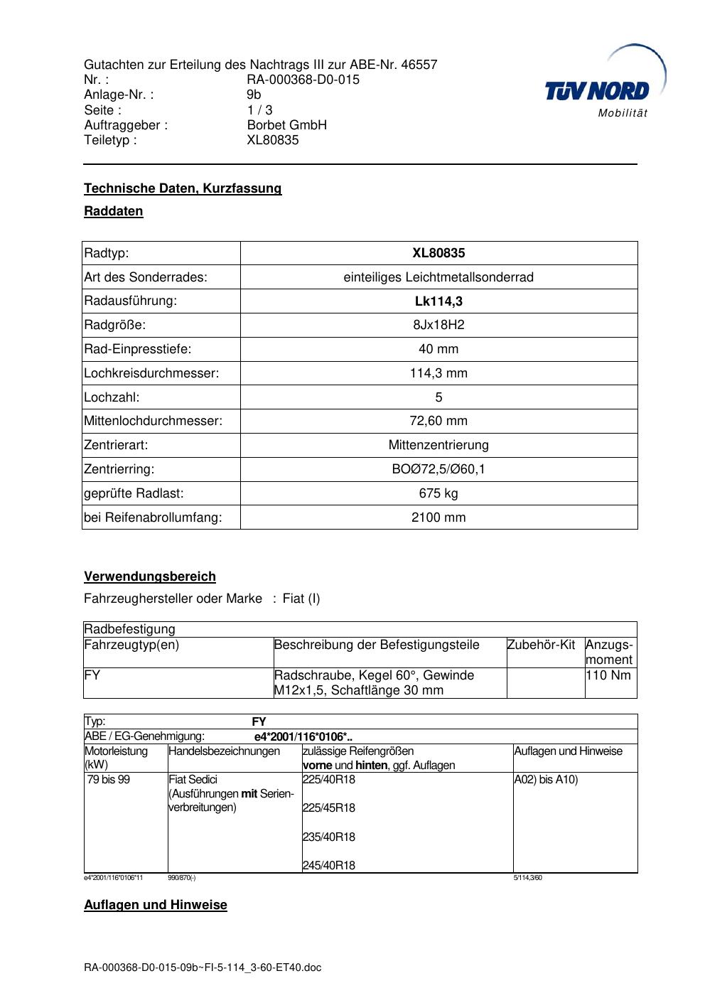Dieses Gutachten (abe) bezieht sich auf die Alufelge brand-borbet XL80835 in der Ausführung 8Jx18 ET 0, Mittenloch 0 mm (KBA 46557). Im PDF findest du typischerweise zulässige Reifengrößen, Auflagen/Anbauhinweise und – je nach Dokument – Hinweise zur Eintragung.