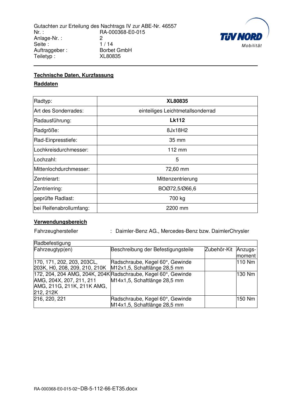 Dieses Gutachten (abe) bezieht sich auf die Alufelge brand-borbet XL80835 in der Ausführung 8Jx18 ET 0, Mittenloch 0 mm (KBA 46557). Im PDF findest du typischerweise zulässige Reifengrößen, Auflagen/Anbauhinweise und – je nach Dokument – Hinweise zur Eintragung.
