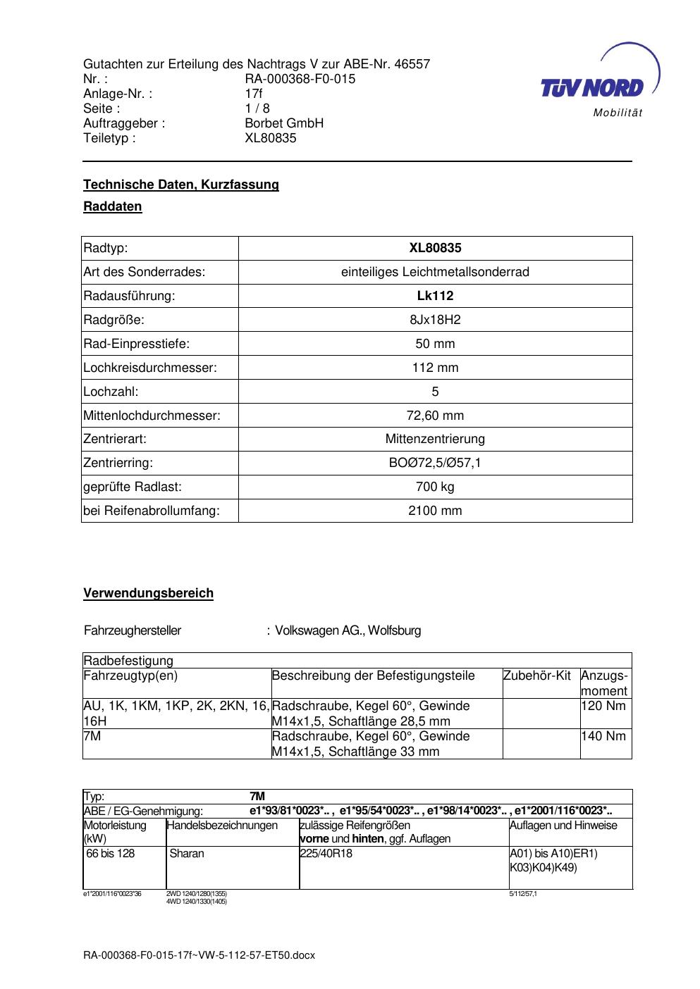 Dieses Gutachten (abe) bezieht sich auf die Alufelge brand-borbet XL80835 in der Ausführung 8Jx18 ET 0, Mittenloch 0 mm (KBA 46557). Im PDF findest du typischerweise zulässige Reifengrößen, Auflagen/Anbauhinweise und – je nach Dokument – Hinweise zur Eintragung.