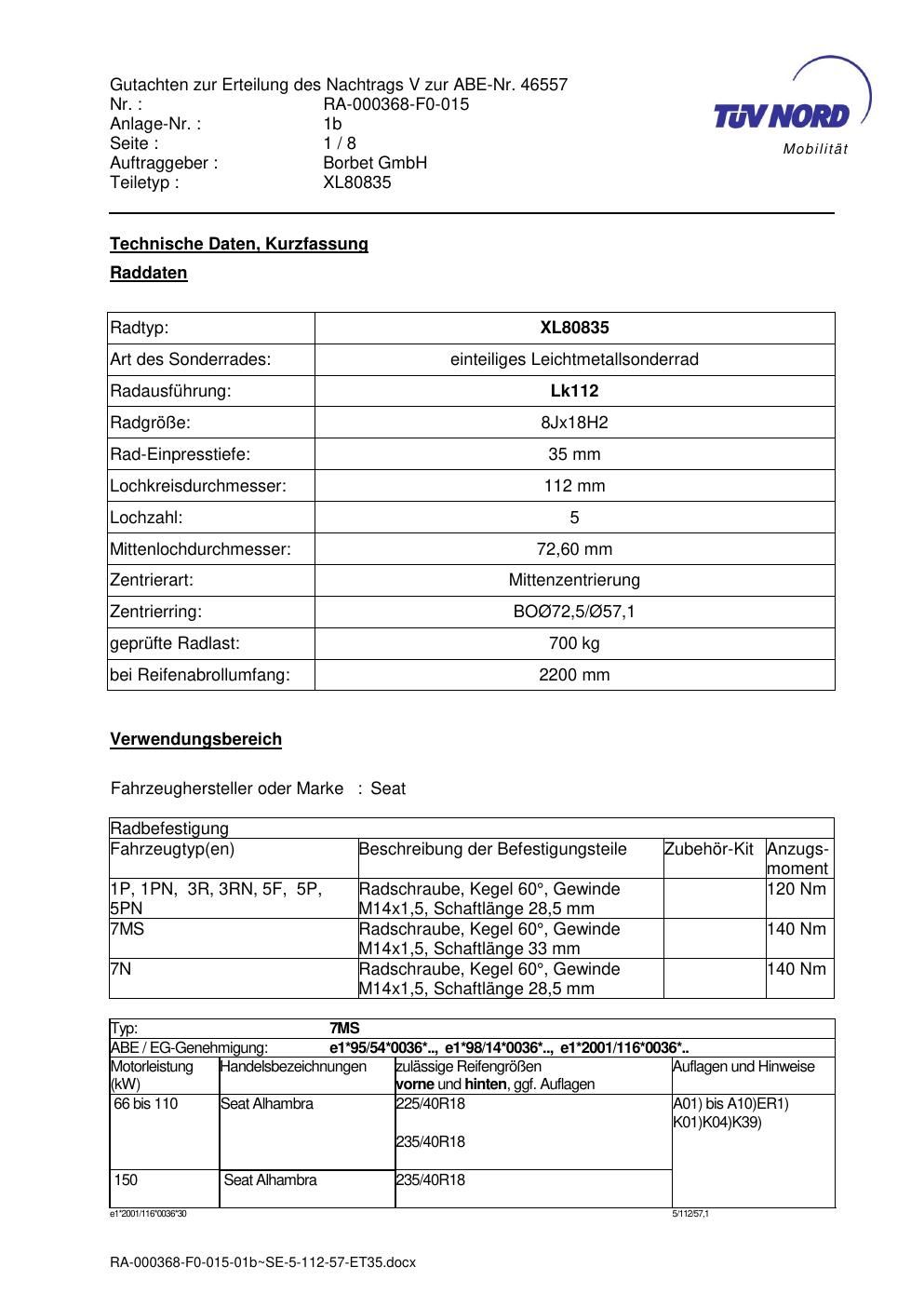 Dieses Gutachten (abe) bezieht sich auf die Alufelge brand-borbet XL80835 in der Ausführung 8Jx18 ET 0, Mittenloch 0 mm (KBA 46557). Im PDF findest du typischerweise zulässige Reifengrößen, Auflagen/Anbauhinweise und – je nach Dokument – Hinweise zur Eintragung.