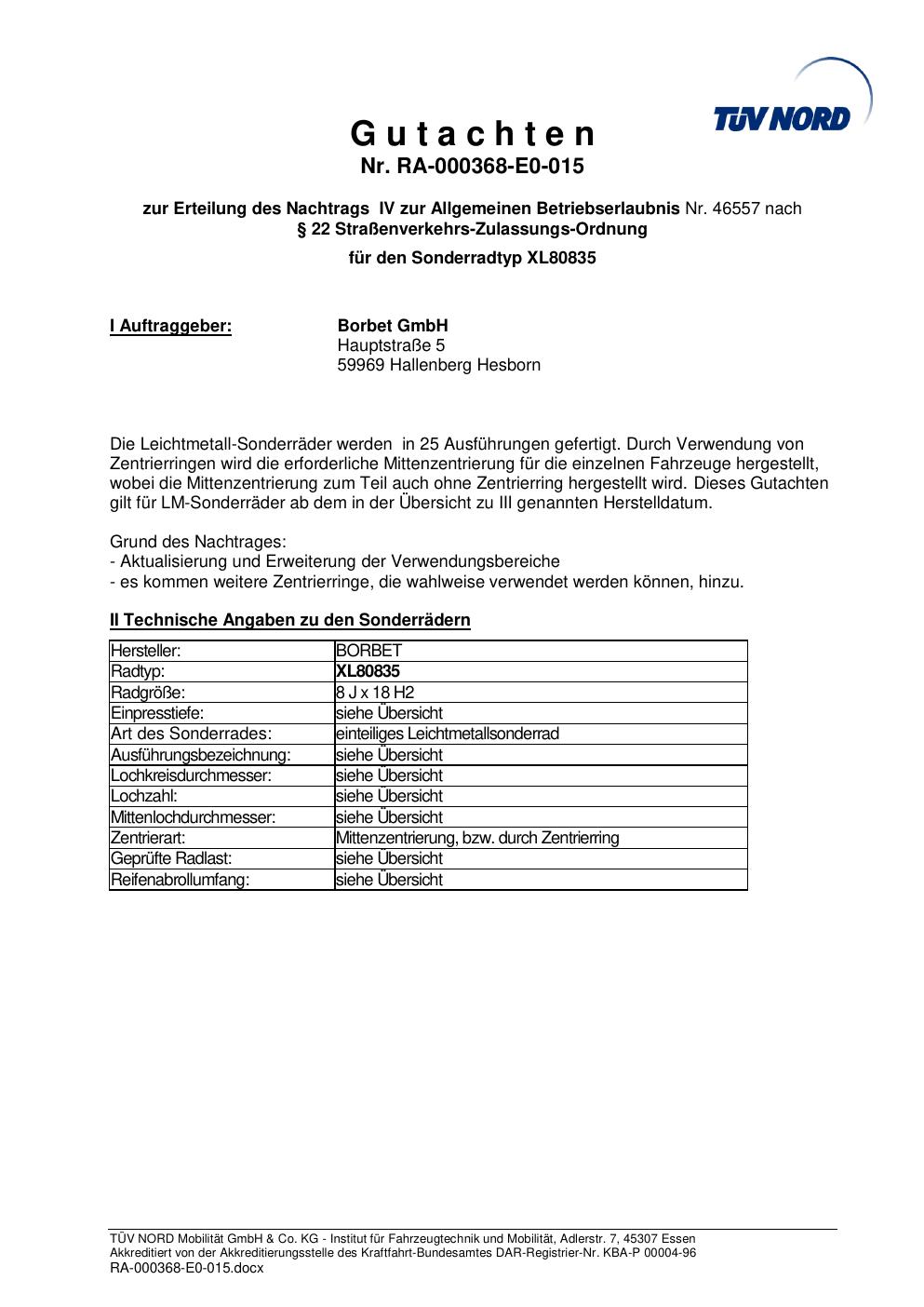 Dieses Gutachten (abe) bezieht sich auf die Alufelge brand-borbet XL80835 in der Ausführung 8Jx18 ET 0, Mittenloch 0 mm (KBA 46557). Im PDF findest du typischerweise zulässige Reifengrößen, Auflagen/Anbauhinweise und – je nach Dokument – Hinweise zur Eintragung.