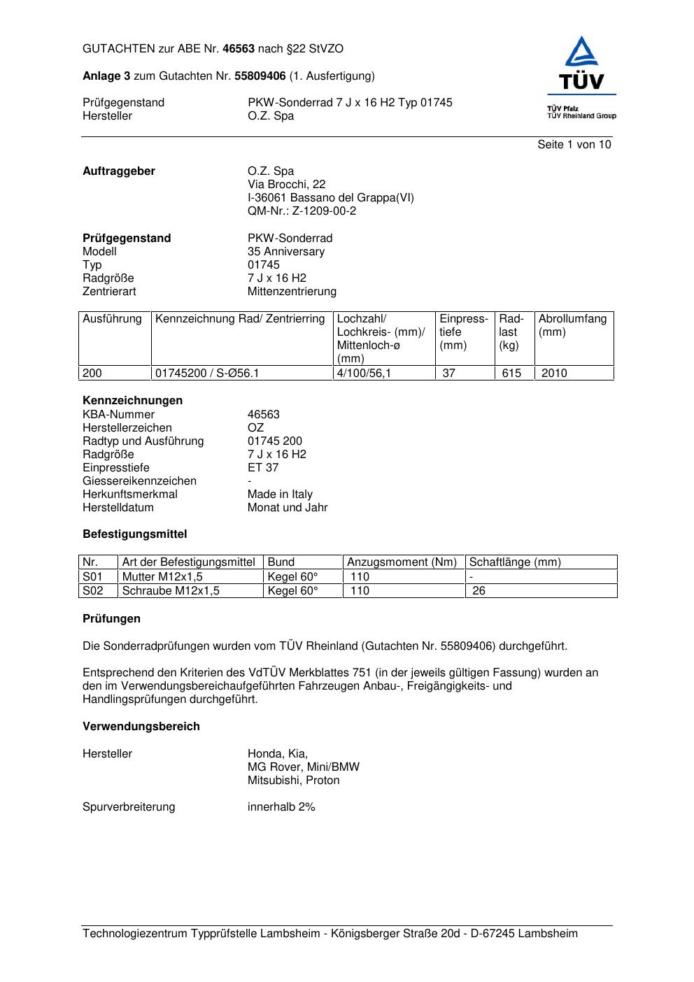 Dieses Gutachten (abe) bezieht sich auf die Alufelge co-rod 01745 in der Ausführung 7Jx16 ET 0, Mittenloch 0 mm (KBA 46563). Im PDF findest du typischerweise zulässige Reifengrößen, Auflagen/Anbauhinweise und – je nach Dokument – Hinweise zur Eintragung.