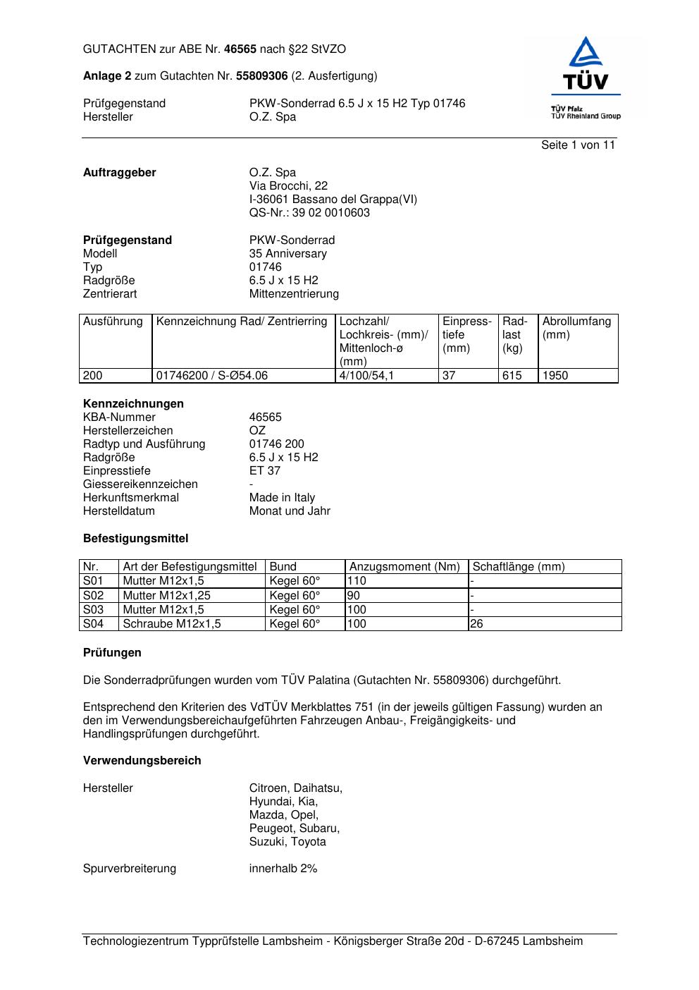 Felgengutachten / abe für Alufelgen ATS 0174 6 (6.5Jx15 ET 0, Mittenloch 0 mm) mit KBA 46565 (Zertifikatsnummer 46565). Hier kostenlos als PDF herunterladen. Der Download-Link ist 24 Stunden gültig und kann bis zu zwei Mal verwendet werden.