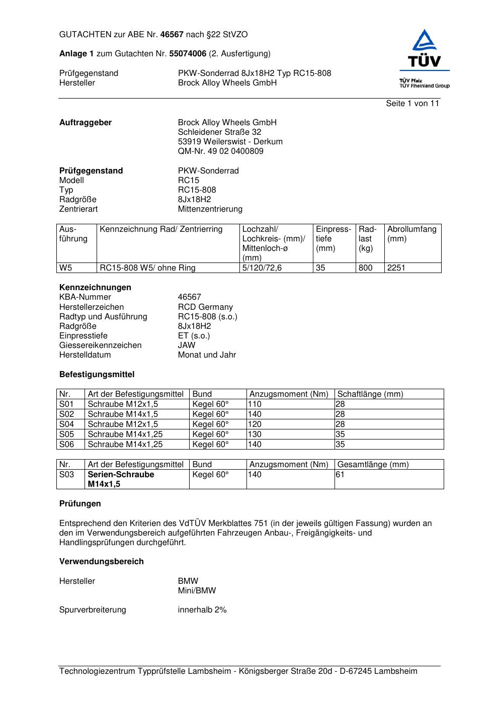 Dieses Gutachten (abe) bezieht sich auf die Alufelge Brock RC15-808 in der Ausführung 8Jx18 ET 0, Mittenloch 0 mm (KBA 46567). Im PDF findest du typischerweise zulässige Reifengrößen, Auflagen/Anbauhinweise und – je nach Dokument – Hinweise zur Eintragung.