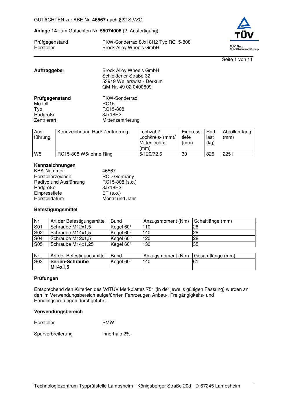 Dieses Gutachten (abe) bezieht sich auf die Alufelge Brock RC15-808 in der Ausführung 8Jx18 ET 0, Mittenloch 0 mm (KBA 46567). Im PDF findest du typischerweise zulässige Reifengrößen, Auflagen/Anbauhinweise und – je nach Dokument – Hinweise zur Eintragung.