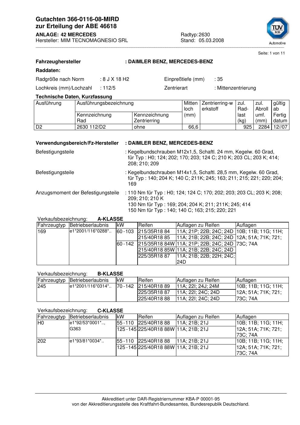 Dieses abe führt 3 Fahrzeugvarianten von 2 Fahrzeugherstellern als zulässig auf. Abgedeckt werden insbesondere Fahrzeuge von DAIMLER, MERCEDES-BENZ. Prüfe in der folgenden Liste, ob dein konkretes Fahrzeugmodell und – soweit angegeben – der passende Typ-Code (HSN/TSN-Variante) dabei ist. Der Typ-Code steht im Fahrzeugschein unter den Ziffern 2.1 und 2.2 – eine Schritt-für-Schritt-Anleitung dazu findest du im Wiki-Artikel zum Selbst-Prüfen des Gutachtens.