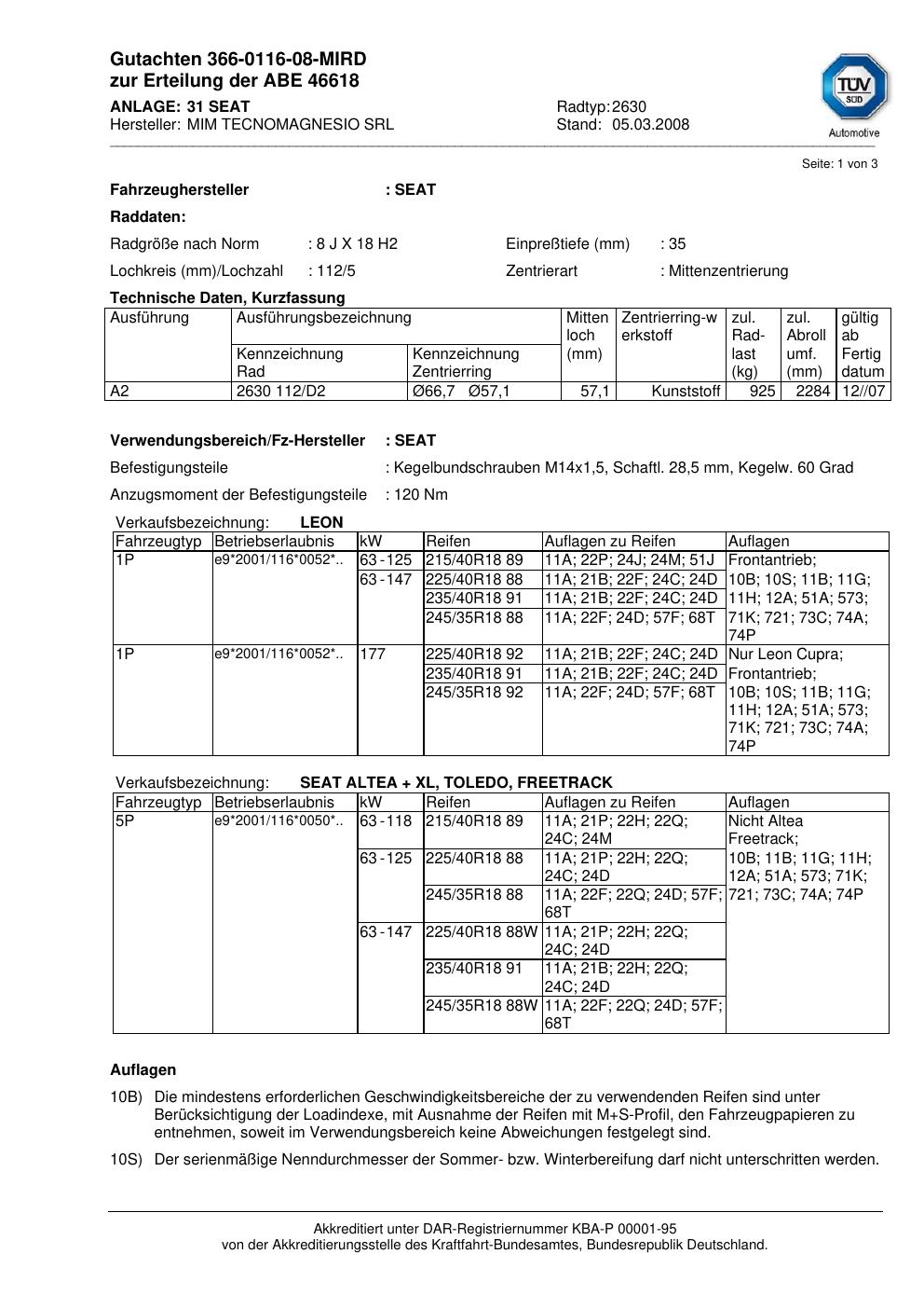 Dieses abe führt 2 Fahrzeugvarianten von 2 Fahrzeugherstellern als zulässig auf. Abgedeckt werden insbesondere Fahrzeuge von CUPRA, SEAT. Prüfe in der folgenden Liste, ob dein konkretes Fahrzeugmodell und – soweit angegeben – der passende Typ-Code (HSN/TSN-Variante) dabei ist. Der Typ-Code steht im Fahrzeugschein unter den Ziffern 2.1 und 2.2 – eine Schritt-für-Schritt-Anleitung dazu findest du im Wiki-Artikel zum Selbst-Prüfen des Gutachtens.