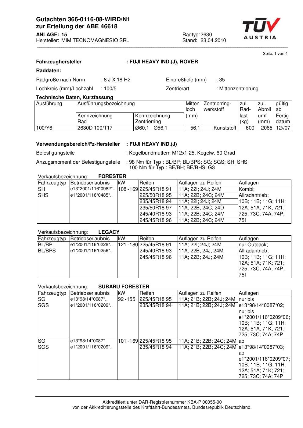 Dieses abe führt 3 Fahrzeugvarianten von 3 Fahrzeugherstellern als zulässig auf. Abgedeckt werden insbesondere Fahrzeuge von MG, ROVER, SUBARU. Prüfe in der folgenden Liste, ob dein konkretes Fahrzeugmodell und – soweit angegeben – der passende Typ-Code (HSN/TSN-Variante) dabei ist. Der Typ-Code steht im Fahrzeugschein unter den Ziffern 2.1 und 2.2 – eine Schritt-für-Schritt-Anleitung dazu findest du im Wiki-Artikel zum Selbst-Prüfen des Gutachtens.